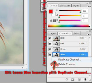 4. Kemudian klik kanan channels Blue, lalu pilih Duplicate Channel - Oke. Maka channels Blue akan jadi 2 atau terduplicate. Lebih jelasnya bisa lihat gambar di atas.